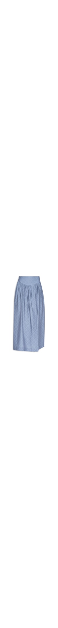 A saia azul é confeccionada em tecido leve com superfície texturizada e sem elasticidade. A peça solta ao corpo possui cintura alta, cós estendido com recorte frontal assimétrico com franzido, fenda frontal, forro em short, comprimento midi e fechamento lateral por zíper invisível.