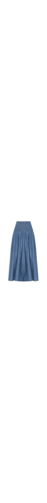 A saia azul é confeccionada em sarja com lavagem jeans e sem elasticidade. A peça solta ao corpo possui cintura alta, cós com elástico embutido e comprimento midi.