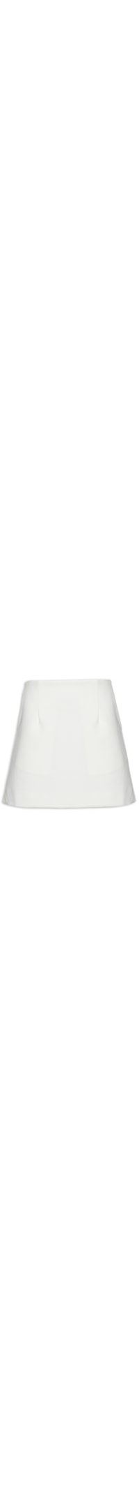 A saia branca é confeccionada em malha encorpada de baixa elasticidade. A peça solta ao corpo, possui cintura alta, bolsos faca frontais, fendas laterais, comprimento curto, forro e fechamento posterior por zíper invisível.