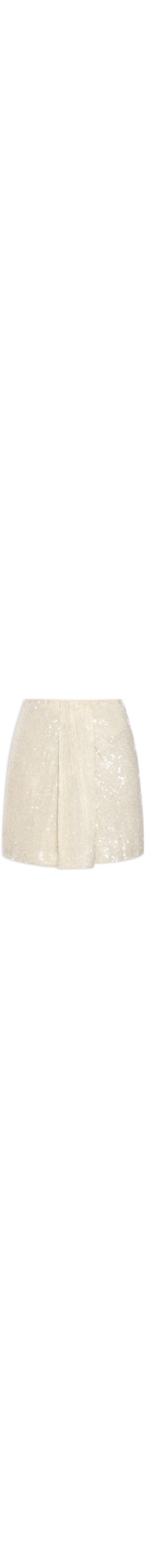 A saia bege é confeccionada em tecido leve com superfície em paetês. A peça possui cintura alta, recorte frontal sobreposto com detalhe de drapeado, forro, comprimento curto, shape solto e fechamento posterior por zíper invisível.