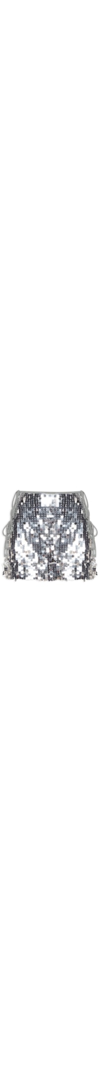 A saia prateada é confeccionada em tecido leve com superfície em paetês sem elasticidade. A peça solta ao corpo possui cintura alta, tiras finas aplicadas nas laterais para amarração, transparência e comprimento curto.