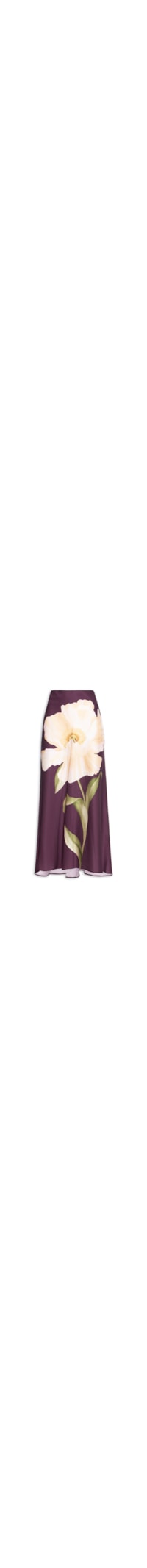 A saia roxa é confeccionada por tecido leve sem elasticidade. A peça solta ao corpo possui cintura alta, elástico aplicado no cós, estampa figurativa floral em cores contrastantes e comprimento midi.
