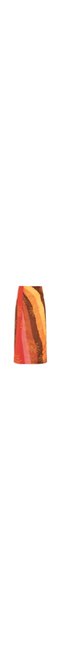 A saia laranja é confeccionada em tecido leve sem elasticidade. A peça solta ao corpo de modelo pareô possui cintura alta, recorte frontal sobreposto com detalhes de pregas, mix de estampas em cores contrastantes, fenda frontal, comprimento midi e fechamento posterior por zíper invisível.