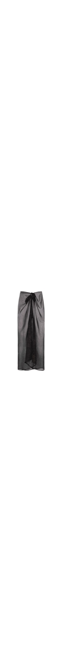 A saia preta é confeccionada em tecido leve sem elasticidade. A peça modelo pareô possui cintura alta, fenda frontal, amarração frontal, mix de estampas em cor contrastante, transparência e comprimento longo.
