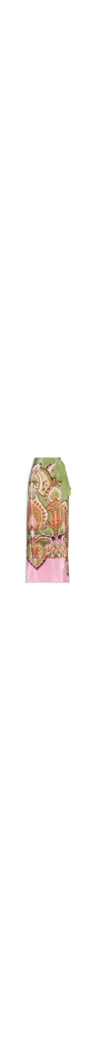 A saia verde é confeccionada em tecido leve sem elasticidade. A peça solta ao corpo de modelo pareô possui cintura alta, cós com passantes aplicados, mix de estampas em cores contrastantes, comprimento longo e fechamento lateral por tiras alongadas para amarração.