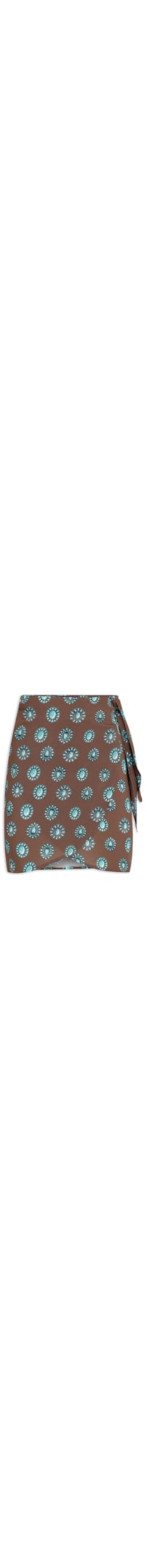 A saia marrom é confeccionada em malha. A peça possui cintura alta, faixas alongadas na altura da cintura, estampa figurativa de pedraria em cor contrastante, comprimento curto e fechamento lateral por amarração.