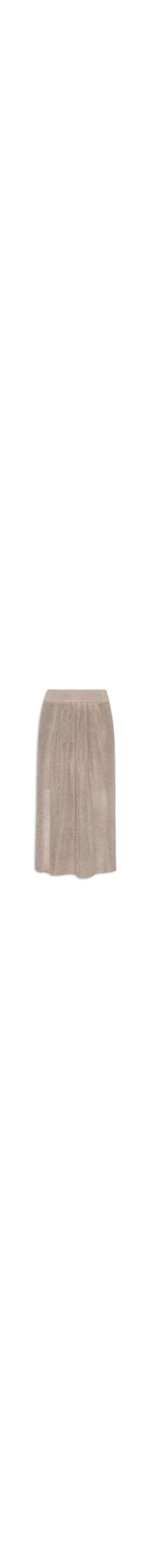 A saia bege é confeccionada em tricot com fios de lurex e média elasticidade. A peça solta ao corpo possui cintura alta, recorte sobreposto com detalhe de pregas e fenda frontal, tag metalizada da marca aplicada na parte posterior, leve transparência e comprimento midi.