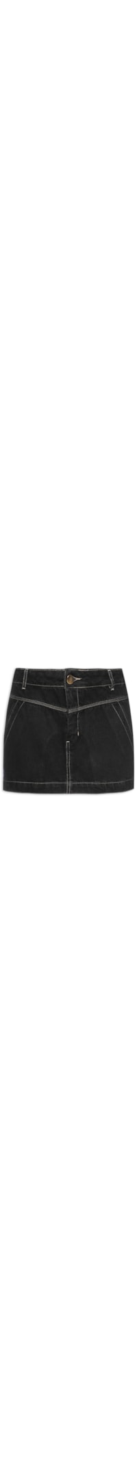 A saia preta é confeccionado por sarja sem elasticidade. A peça solta ao corpo possui cintura baixa, passante aplicado no cós, recortes frontais e posteriores com acabamento pespontado, bolsos frontais no modelo faca, bolsos posteriores, fechamento por zíper e botão e comprimento curto.