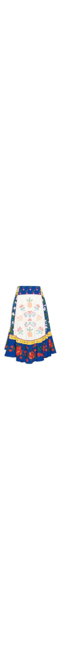 A saia azul é confeccionada em tecido leve sem elasticidade. A peça solta ao corpo, possui cintura alta, recortes frontais e posteriores com vivo rosa aplicado, recorte frontal e posterior em cor contrastante com mix de bordados figurativos em ponto cruz de cores contrastantes, mix de estampas florais em cores contrastantes, barra arredondada, comprimento midi e fechamento lateral por zíper invisível.