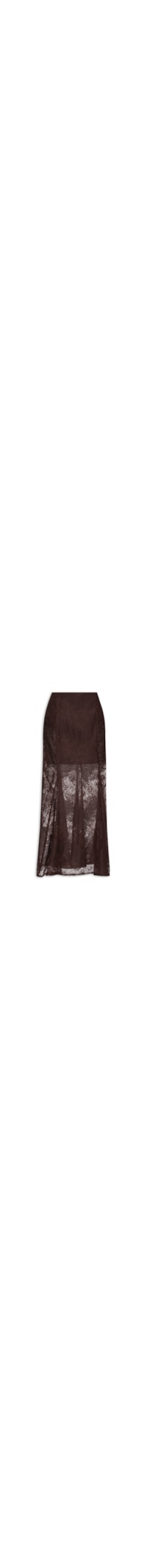 A saia marrom é confeccionada em renda sem elasticidade. A peça solta ao corpo possui cintura alta, recortes posteriores e frontais, meio forro, transparência, comprimento longo e fechamento posterior por zíper.