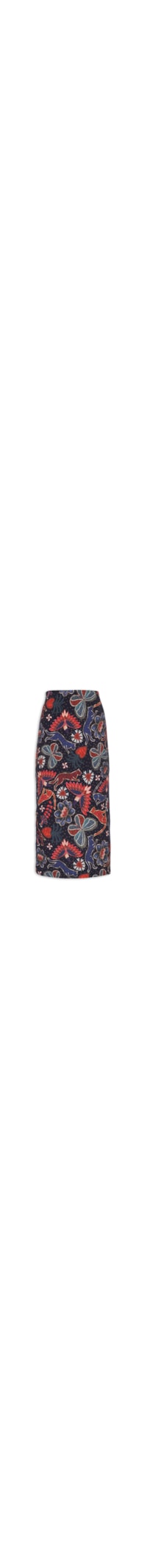 A saia azul é confeccionada em malha com superfície canelada e média elasticidade. A peça justa ao corpo possui cintura alta, cós com elástico embutido, recorte nas laterais com frisos em tons contrastantes, mix de estampas figurativas em tons contrastantes e comprimento midi.