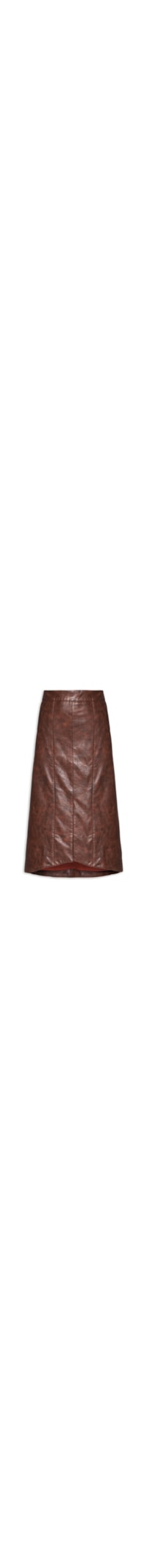 A saia marrom é confeccionada em material sintético sem elasticidade. A peça solta ao corpo possui cintura alta, bolsos frontais modelo faca, recortes frontais e posteriores, fenda frontal, barra mullet*, comprimento midi, forro e fechamento posterior por zíper metálico.