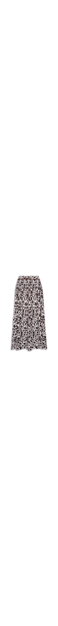 A saia animal print é confeccionada em tricot com fios de lurex e alta elasticidade. A peça solta ao corpo possui cintura alta, cós com elástico embutido, superfície plissada e comprimento midi.