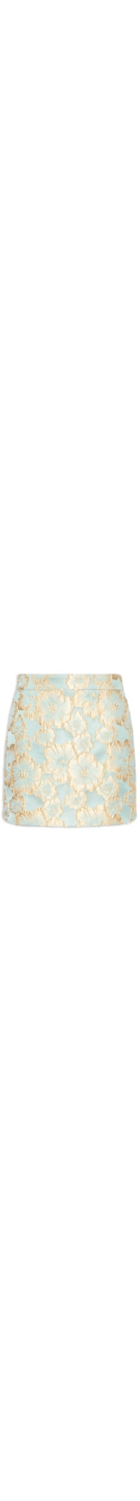 A saia azul é confeccionada em tecido leve sem elasticidade. A peça solta ao corpo possui cintura alta, bolsos frontais de modelo faca, pences posteriores, aplicação de bordados florais em tom metalizado, forro, comprimento curto e fechamento posterior por zíper.