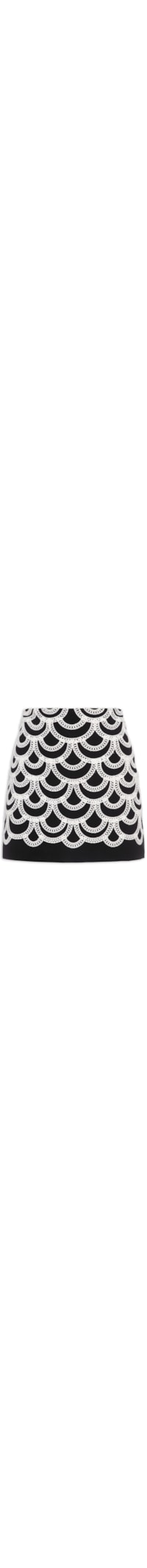 A saia preta é confeccionada em tecido leve sem elasticidade. A peça justa ao corpo possui cintura alta, pences posteriores, recorte posterior, bordado frontal geométrico de cordão na cor off white, forro, comprimento curto e fechamento posterior por zíper invisível.