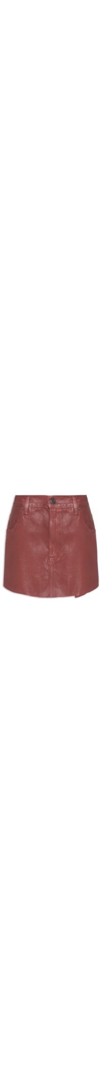 A saia vinho é confeccionado em sarja com superfície resinada e sem elasticidade. A peça solta ao corpo possui cintura média, cós com passantes e tag da marca bordada na parte posterior, bolsos frontais e posteriores com rebites aplicados, recortes frontais e posteriores, comprimento curto e fechamento frontal em zíper e botão.