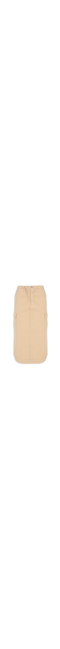 A saia bege é confeccionada por sarja com média sem elasticidade. A peça solta ao corpo possui cintura média, elástico embutido no cós para ajuste, passantes aplicados no cós, bolsos frontais no modelo faca, bolsos laterais no modelo cargo com aba sobreposta, recorte frontal, bolsos posteriores, recortes e fenda posterior, barra com acabamento arredondado, fechamento por zíper e botão e comprimento midi.