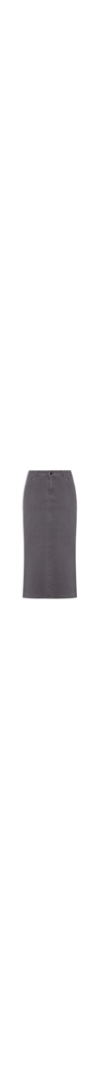 A saia cinza é confeccionada em sarja de média elasticidade. A peça justa ao corpo, possui cintura alta, cós com passantes aplicados, bolsos frontais e posteriores, recortes frontais e posteriores, fenda posterior, comprimento midi e fechamento frontal por zíper e botão metálico.