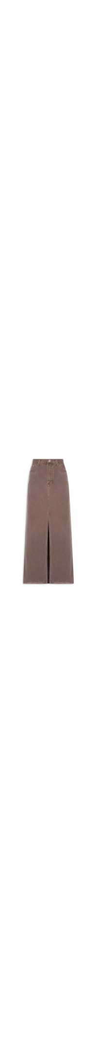 A saia marrom é confeccionada em sarja sem elasticidade. A peça solta ao corpo possui cintura alta, cós com passantes e tag da marca bordada na parte posterior, recortes posteriores, five pockets*, logo da marca aplicado em metal no bolso posterior, recorte frontal com fenda, comprimento midi e fechamento frontal por botão e zíper.