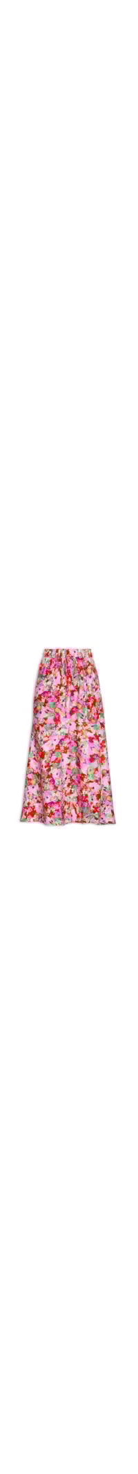 A saia rosa é confeccionada em linho misto sem elasticidade. A peça solta ao corpo possui cintura alta, cós amplo com elástico e cordão embutidos para ajuste, estampa floral em cores contrastantes e comprimento midi.