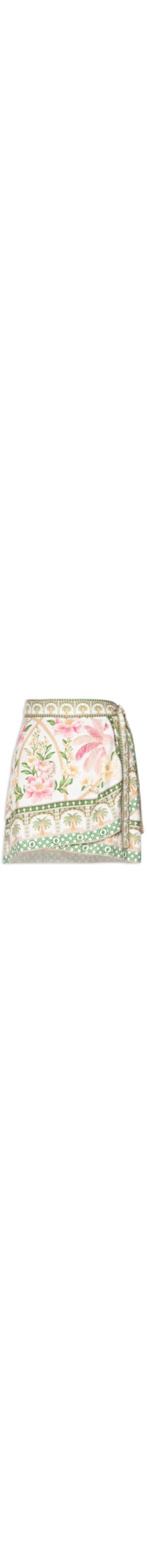 A saia verde é confeccionada por tecido leve sem elasticidade. A peça solta ao corpo possui cintura média, tira média estendida para amarração, recorte frontal sobreposto, padronagem floral em cor contrastante e comprimento curto.