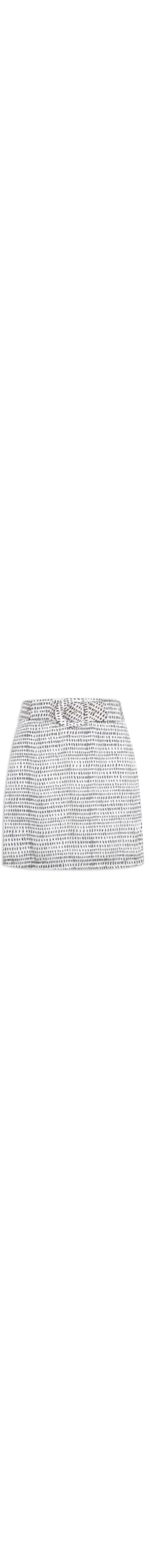 A saia off white é confeccionada em tecido leve sem elasticidade. A peça solta ao corpo possui cintura alta, cós com passantes, estampa abstrata em cor contrastante, detalhe de sobreposição na parte frontal, forro, estampa de poá em cor contrastante, comprimento curto e fechamento posterior por zíper invisível. Acompanha cinto para uso opcional.