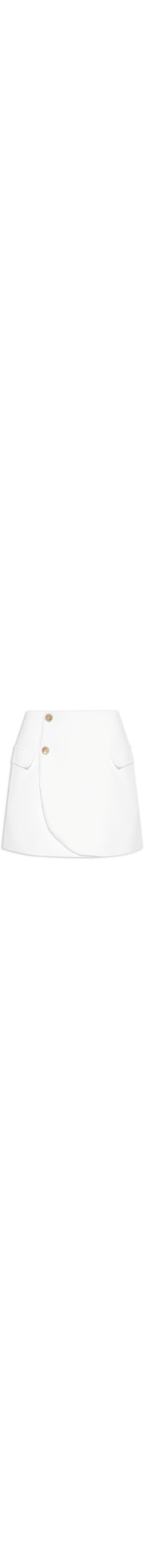 A saia branca é confeccionada por tecido leve com média elasticidade. A peça solta ao corpo possui cintura média, recorte frontal sobreposto com barra arredondada, abas aplicadas nas laterais, forro, fechamento por zíper posterior e comprimento curto.