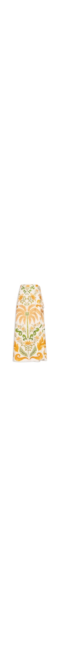A saia amarela é confeccionada em linho misto sem elasticidade. A peça solta ao corpo possui cintura alta, recorte frontal sobreposto com tiras laterais alongadas para amarração, mix de estampas em cores contrastantes e comprimento midi.