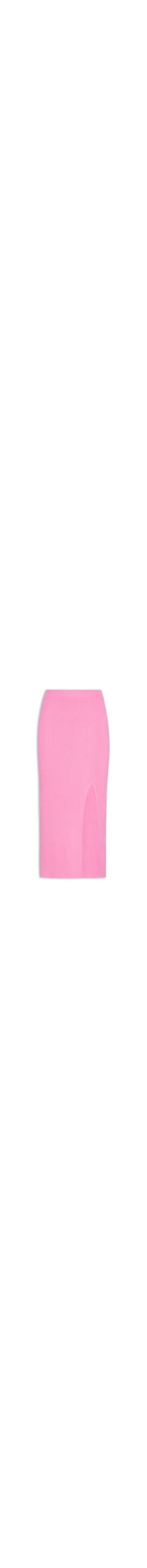 A saia rosa é confeccionada em tricot com superfície canelada de média elasticidade. A peça justa ao corpo, possui cintura alta, cós com elástico embutido, fenda frontal e comprimento midi.
