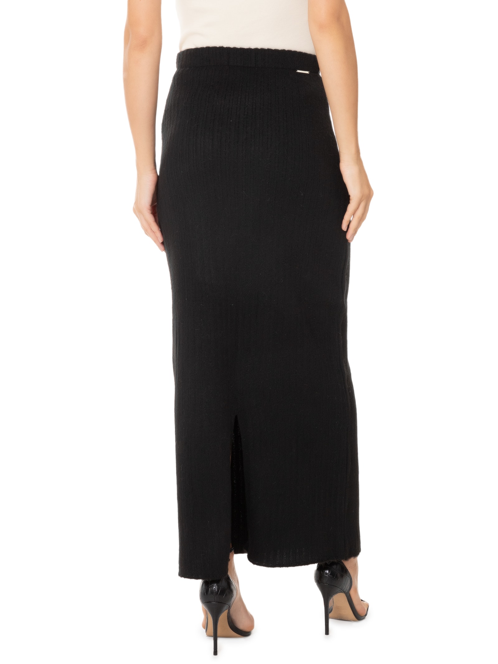 A saia preta é confeccionada em tricot com média elasticidade. A peça justa ao corpo possui cintura alta, cós com elástico embutido, fenda posterior, tag da marca metalizada aplicada na parte posterior e comprimento midi.