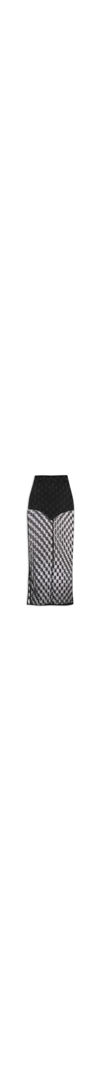 A saia preta é confeccionada em tule com superfície texturizada e média elasticidade. A peça justa ao corpo possui cintura alta, tag metálica da marca na parte posterior do cós, transparência, fenda posterior, comprimento midi e fechamento posterior por zíper invisível. Acompanha hot pant em malha de mesma cor com cós elástico.