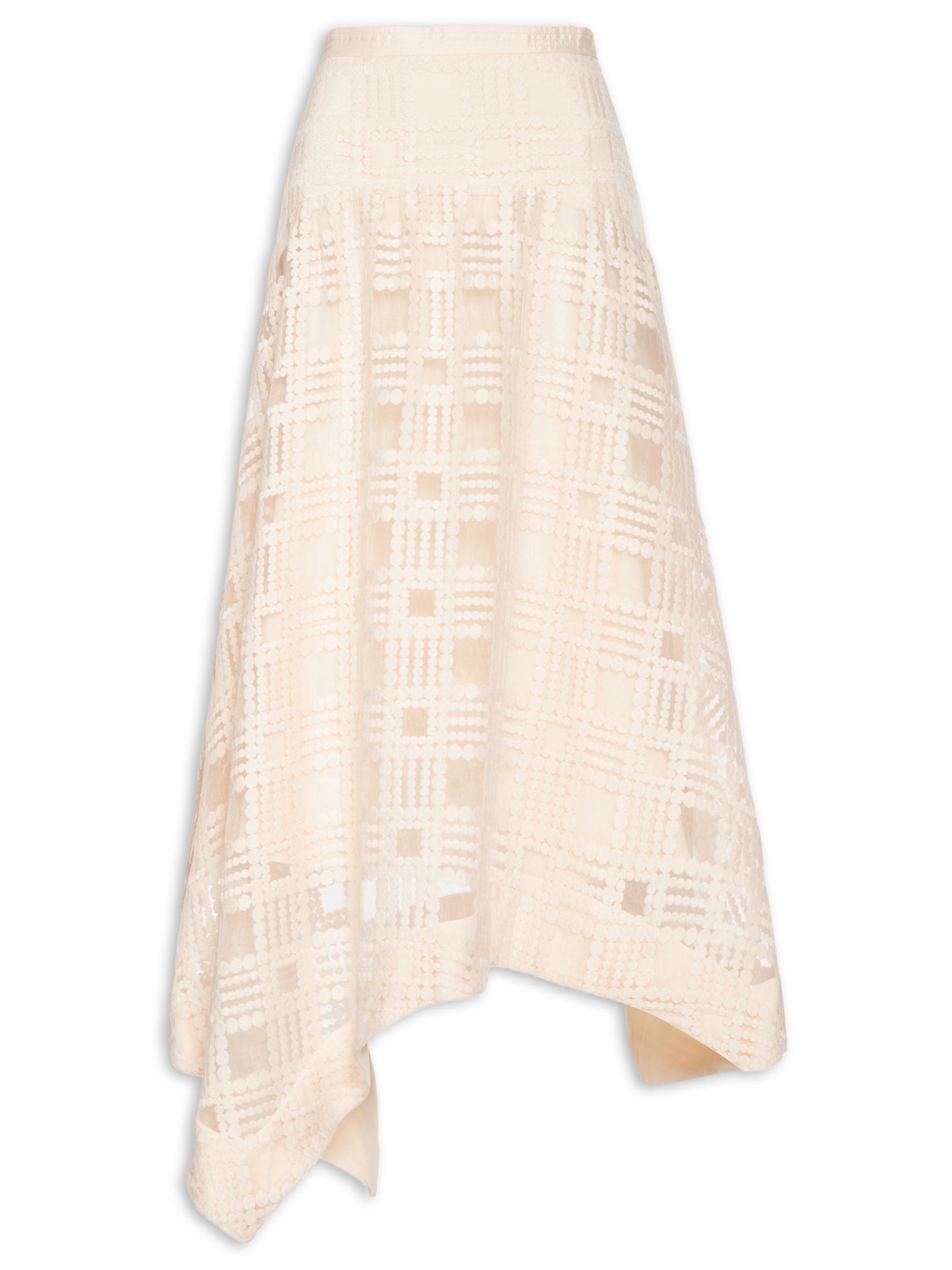 A saia bege é confeccionada em tecido leve transparente e sem elasticidade. A peça solta ao corpo possui cintura alta, recortes frontais e posteriores, detalhe bordados circulares por toda a peça, forro, barra asimétrica, comprimento midi e fechamento latreral por zíper invisível.
