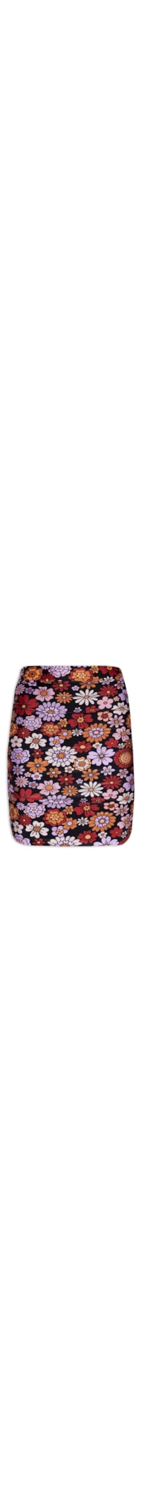 A saia preta é confeccionada em malha de poliamida com alta elasticidade. A peça justa ao corpo possui cintura alta, detalhe de franzido nas laterais, estampa floral em cores contrastantes, barra arredondada e comprimento curto.