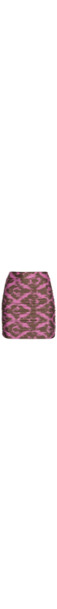 A saia rosa é confeccionada em malha de alta elasticidade. A peça justa ao corpo, possui cintura alta, franzido nas laterais com elástico embutido, estampa abstrata em cores contrastantes, comprimento curto e forro.