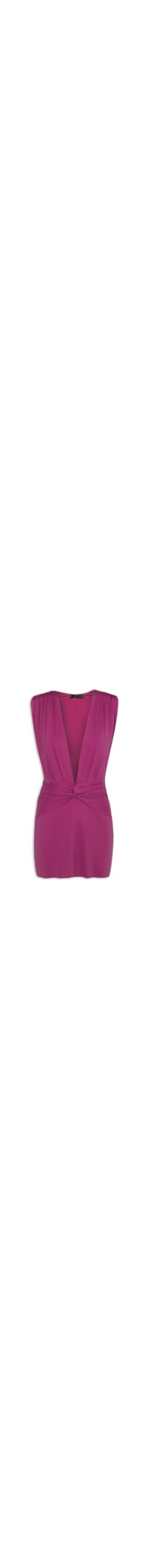 A saída roxa é confeccionada em malha de poliamida. A peça solta ao corpo possui decote v profundo, recorte lateral vazado, detalhe franzido nos ombros, recorte na região da cintura, recorte sobreposto com detalhe de torção frontal e comprimento curto.