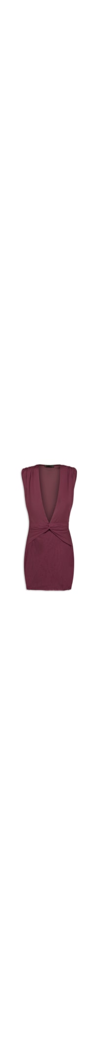 A saída roxa é confeccionada em malha com alta elasticidade. A peça justa ao corpo possui decote V profundo, alças largas com detalhe de franzidos nos ombros, cavas estendidas, detalhe de torção na parte frontal, recorte posterior e comprimento curto.