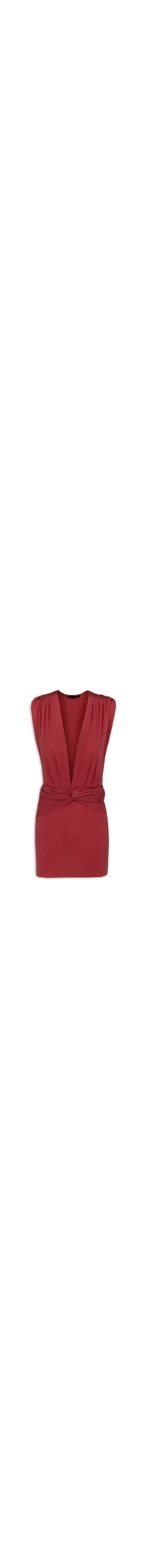 A saída vermelha é confeccionada em malha de poliamida. A peça justa ao corpo possui decote V profundo, alças largas com efeito franzido, cavas alongadas, recorte sobreposto na altura da cintura com detalhe de drapeado e de nó na parte frontal, aviamento metalizado na altura do busto e comprimento curto.