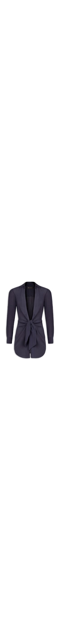 A saída azul marinho é confeccionada em tecido leve sem elasticidade. A peça solta ao corpo, possui colarinho clássico com recorte em V profundo, mangas longas com abotoamento nos punhos, efeito de nó na parte frontal, elástico embutido na parte posterior, leve transparência, fenda frontal e comprimento curto.