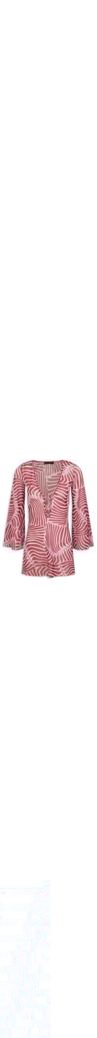A saída vermelha é confeccionada em tecido leve de baixa elasticidade. A peça solta ao corpo, possui decote em V profundo com tira fina aplicada na parte frontal, mangas 7/8 amplas, estampa de folhagem em cor contrastante, leve transparência e comprimento curto.