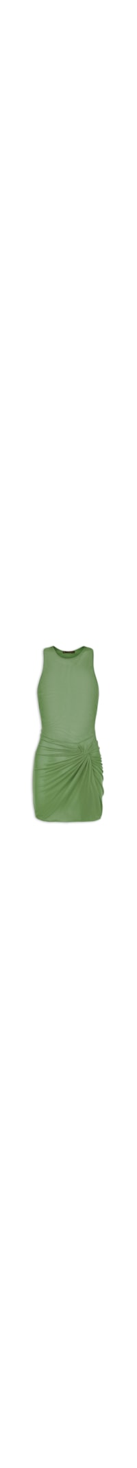 A saída verde é confeccionada em tule com média elasticidade. A peça solta ao corpo possui decote arredondado, alças médias, cavas regulares, transparência, efeito de nó com detalhe drapeado na parte frontal, fenda frontal e comprimento curto.