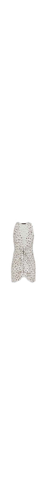 A saída branca é confeccionada em linho misto sem elasticidade. A peça solta ao corpo decote V profundo, alças largas, cavas alongadas, detalhe em nó construtivo frontal, padronagem em cor contrastante e comprimento curto.