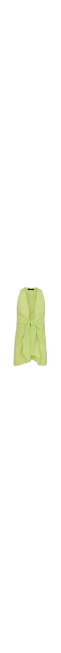 A saída verde é confeccionada por tecido leve sem elasticidade. A peça solta ao corpo possui decote V profundo, alças médias, detalhe frontal em nó, leve transparência e comprimento curto.