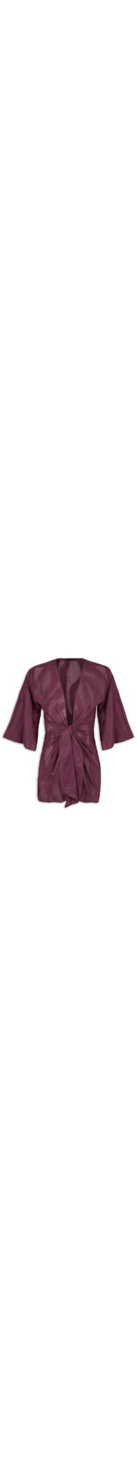 A saida roxa é confeccionada em tecido leve sem elasticidade. A peça solta ao corpo possui decote em V profundo, mangas 3/4 amplas, detalhe de nó na parte frontal, leve transparência e comprimento curto.