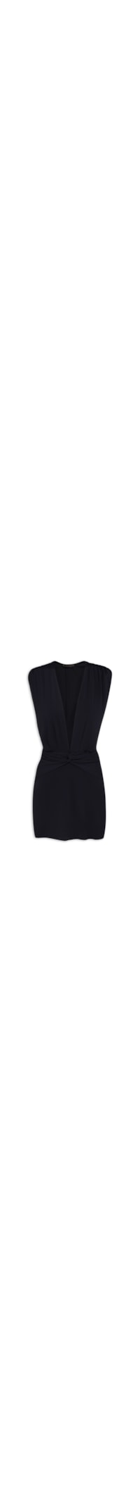 A saída preta é confeccionada em tecido leve com alta elasticidade. A peça possui decote frontal V profundo comprimento curto, alças largas, cavas estendidas, recorte frontal sobreposto na altura da cintura com detalhe de nó, detalhe de franzido na altura dos ombros e na parte posterior na altura da cintura, detalhe de pregas na parte frontal na altura da cintura e comprimento curto.