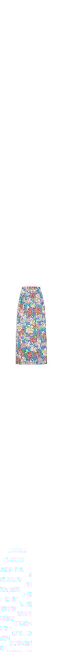 A saída azul é confeccionada em malha com alta elasticidade. A peça solta ao corpo possui cintura alta, cós amplo com elástico embutido, recorte frontal com fendas e detalhe de sobreposição, estampa floral em cores contrastantes e comprimento longo.