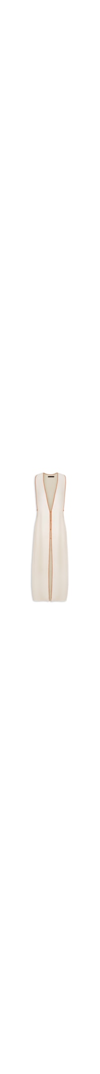 A saida branca é confeccionado em linho misto sem elasticidade. A peça solta ao corpo possui decote em V profundo , alças largas, cavas alongadas, fendas laterais e frontal, acabamentos em cor contrastante e comprimento longo.