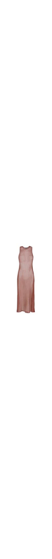 A saída vermelha é confeccionada em tela. A peça possui decote redondo, alças médias, cavas estendidas, transparência, fendas laterais, comprimento midi e shape solto.
