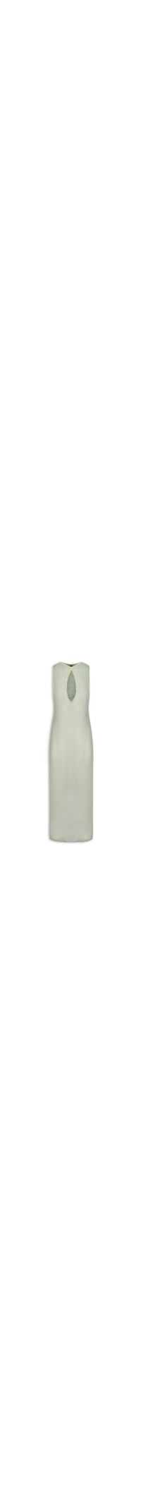 A saída verde é produzida em tricot sem elasticidade. A peça solta ao corpo possui decote V com recorte vazado, alças média, cavas estendidas, fendas laterais, alta transparência e comprimento midi.