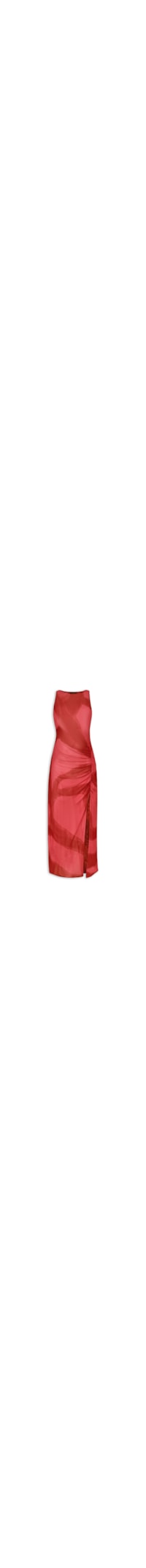 A saída rosa é confeccionada em tecido leve. A peça solta ao corpo possui decote halter, alças médias, cavas estendidas, fenda lateral, padronagem listrada em cor contrastante e comprimento midi.