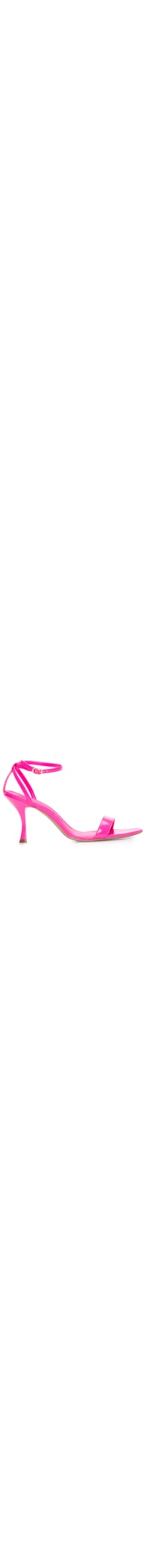 A sandália rosa é produzida em couro. A peça possui bico fino, tiras média na parte frontal, palmilha macia com o nome da marca aplicado, salto alto, solado laqueado, acabamento pespontado e fechamento lateral por fivela metálica com regulagem.